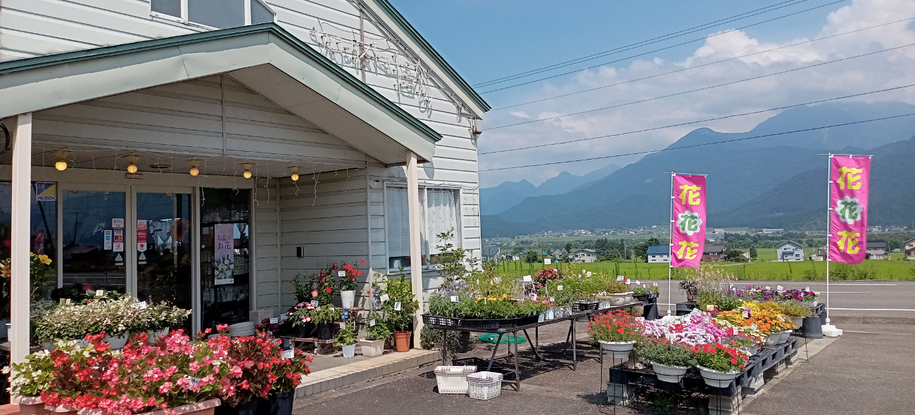 国道17号線沿いに建ち、店舗外にも花がいっぱいの「フローリストたかの」です。