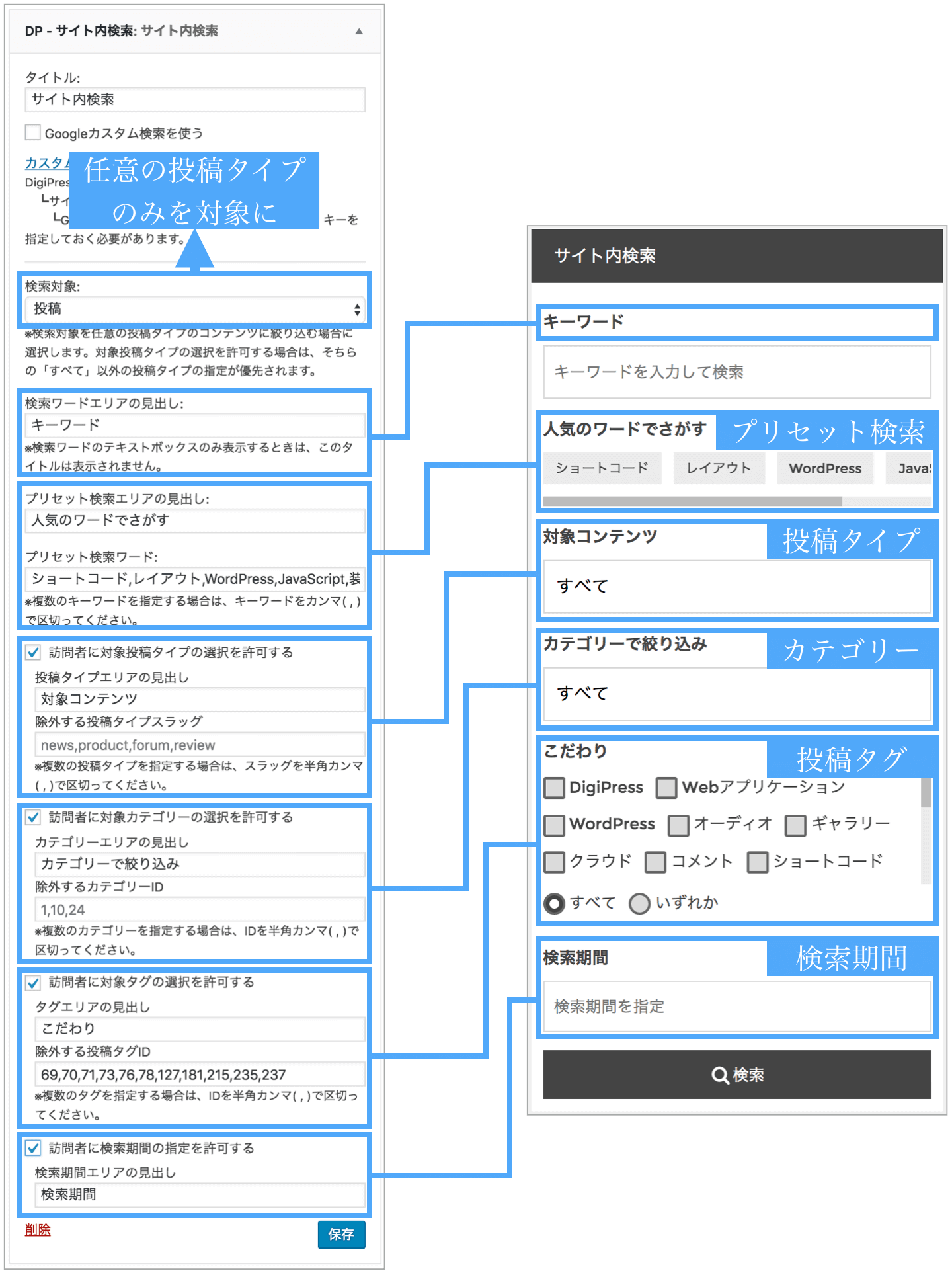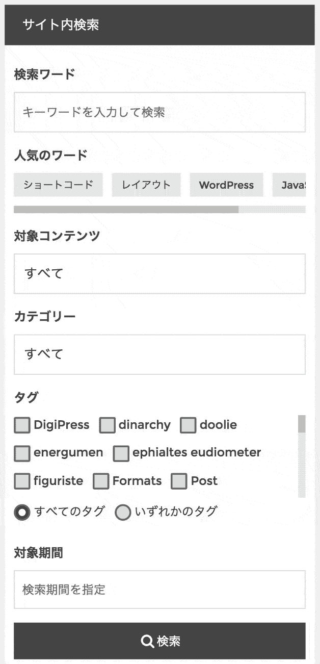 WordPress に組み込まれている標準の検索ウィジェットでは、検索ワードのテキスト入力フォームのみしか表示できませんが、DigiPress のサイト内検索ウィジェットでは、対象コンテンツ(投稿タイプ)、対象カテゴリー、対象タグ、検索期間を組み合わせて高度なサイト内検索を提供しています。