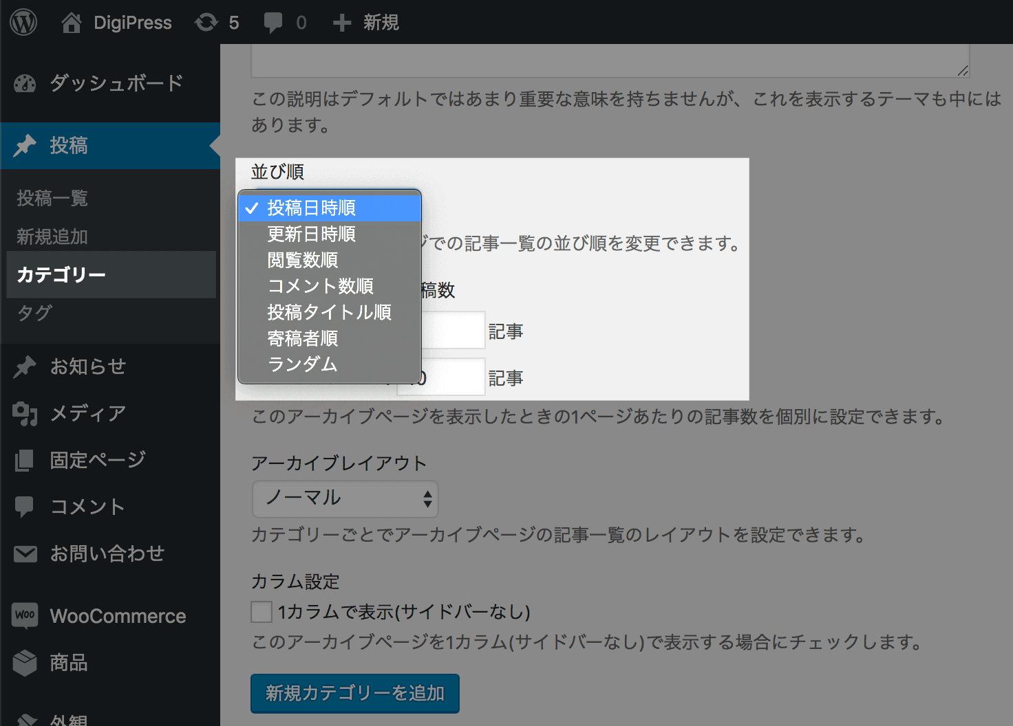 カテゴリーおよびタグの新規追加時に、該当のアーカイブページでの記事一覧の並び順を指定できます。