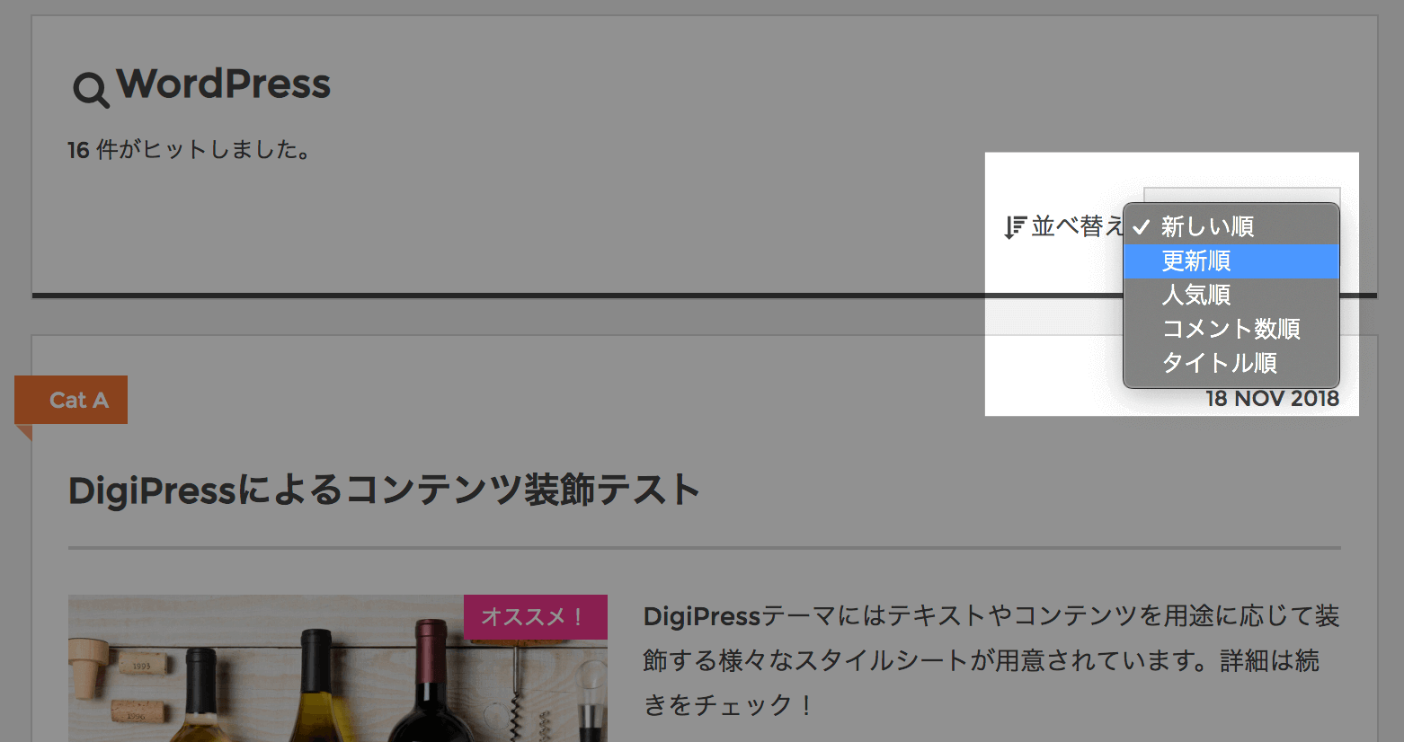 サイトにアクセスしている閲覧者自身が、表示中のアーカイブページの記事一覧の表示順序を、プルダウンメニューから別のソート方法に直接変更して表示することができます。