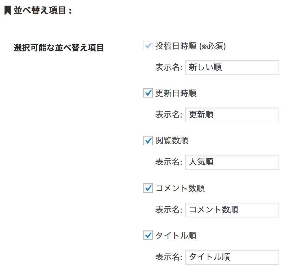 閲覧者による並べ替えを許可した場合、さらに並べ替えの方法の選択肢とその表示名(ラベル)を個別に指定できます。