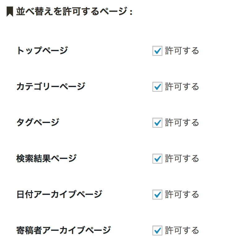 テーマオプションにて、以下のアーカイブページごとで閲覧者による記事一覧の並べ替えの許可を設定できます。